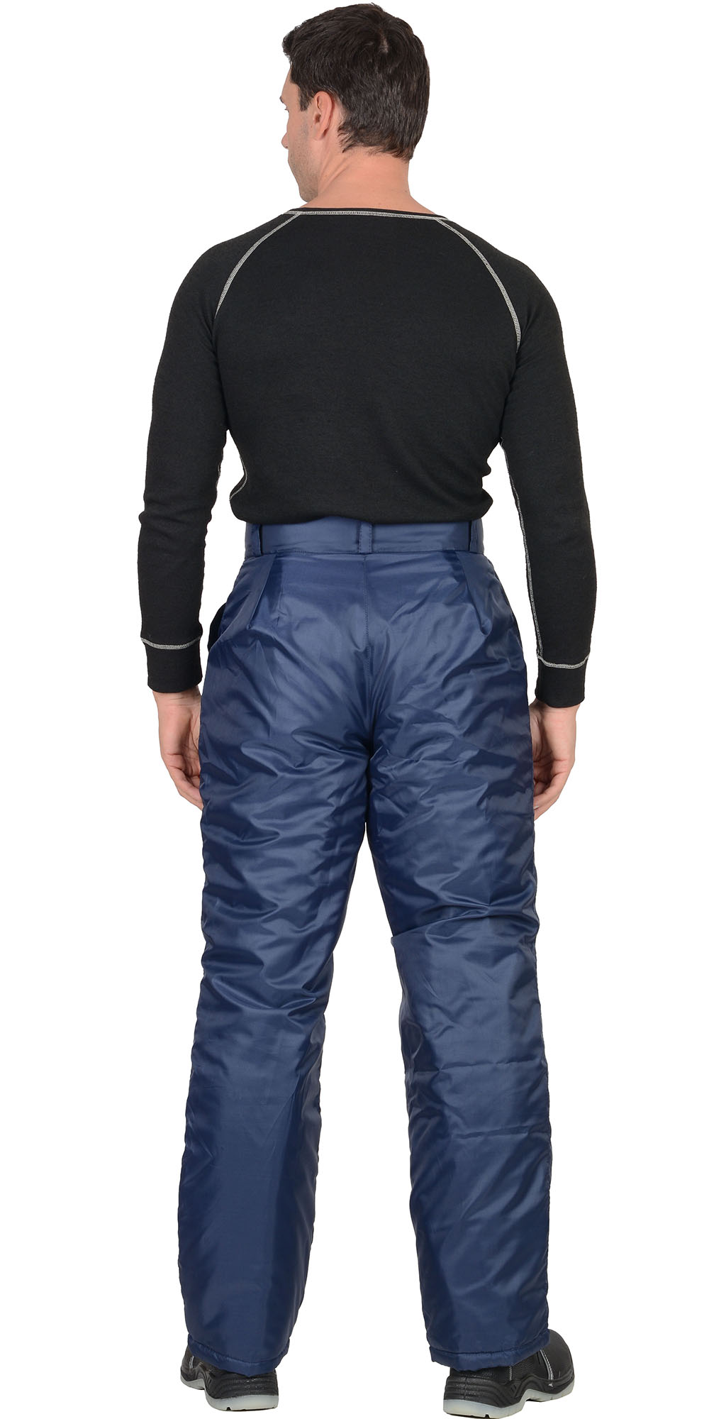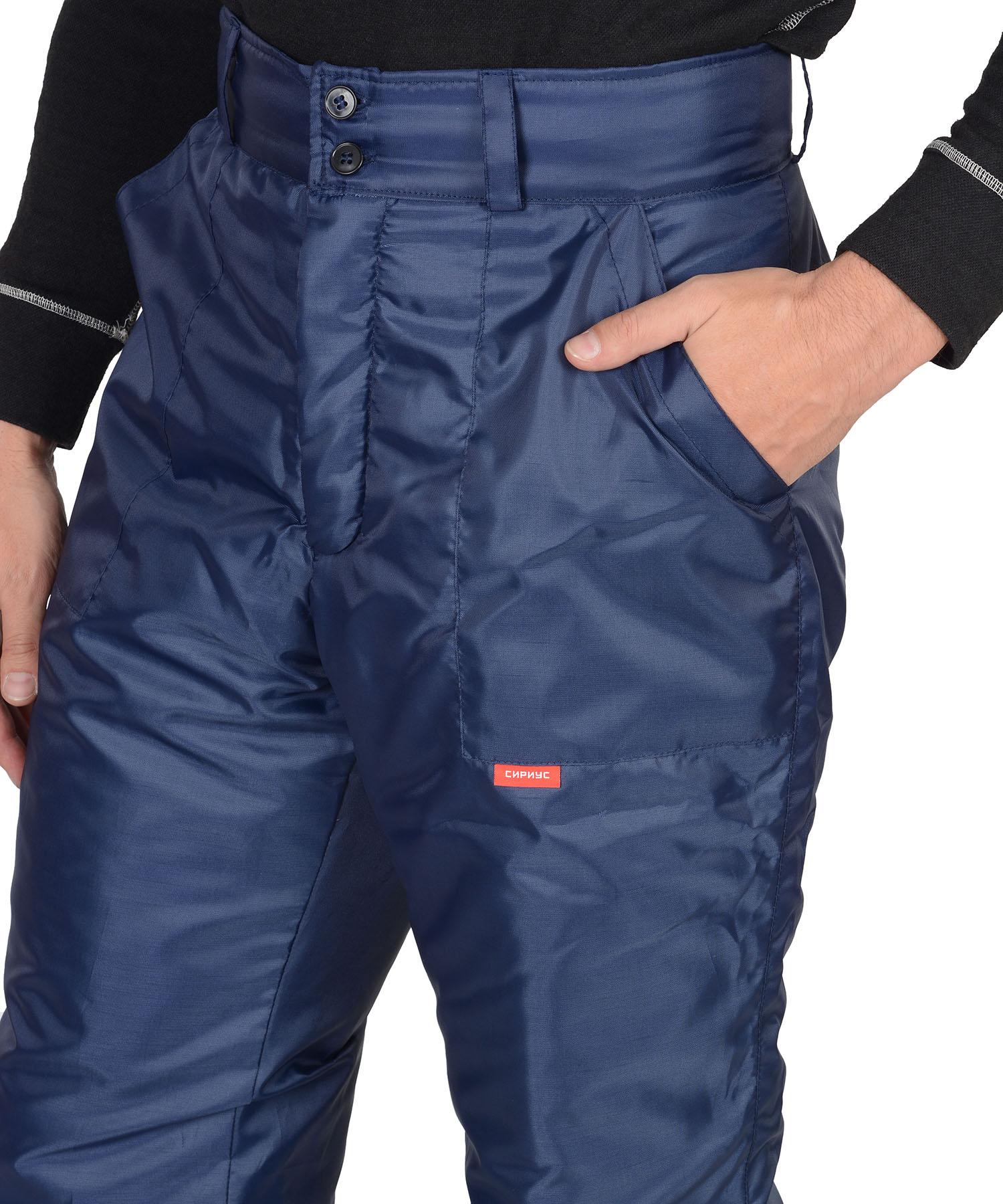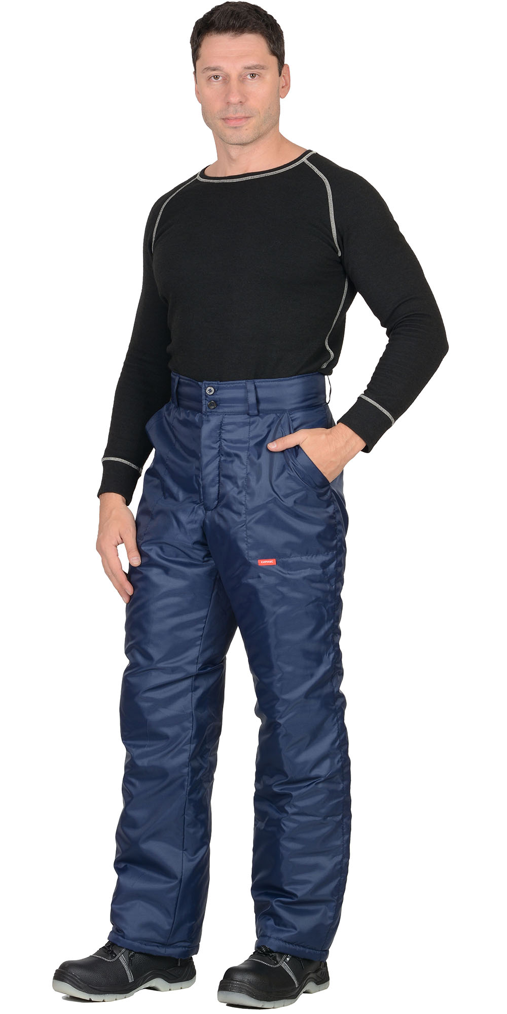 Брюки прямые, с притачной утеплённой подкладкой, с центральной застежкой гульфика на тесьму – «молния», широким поясом, с застежкой на две обметанные петли и пуговицы, пятью шлёвками: две на передней, и три на задней части пояса; с боковыми накладными карманами с наклонным входом.