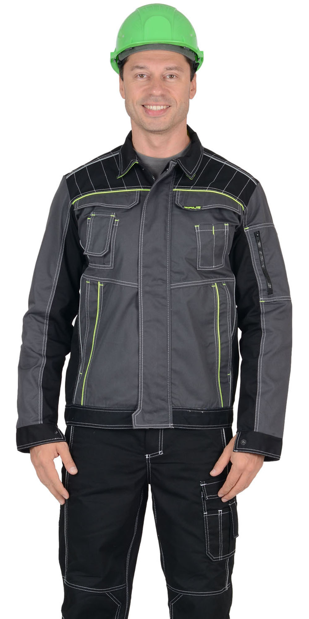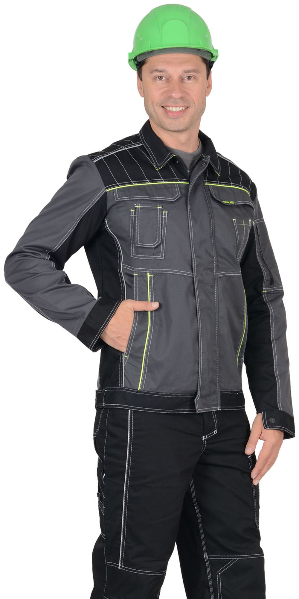 Куртка двухцветная, с воротником стойка, с застёжкой на тесьму молния под ветрозащитной планкой, с нагрудными карманами с клапанами, с нижними вместительными карманами. По низу куртки пояс с хлястиками по боковым сторонам с кнопками для регулировки объёма куртки внизу. Рукава с манжетой, частично стянутой резинкой, на левом рукаве накладной карман с молнией. В куртке предусмотрен светоотражающий кант и кант лимонного цвета ткани для акцента видимости в тёмное время суток и на отдалённом расстоянии.